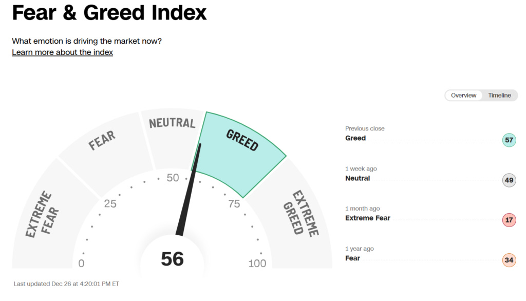 U.S. equity markets began the holiday‑shortened trading week on a firm footing. Broad gains in major indexes and the start of the Santa Claus rally marked this week. Following modest volatility in trading earlier in December, sentiment improved significantly as investors bet on year-end flows. As shown, the CNN Fear-Greed Index has moved materially higher from its readings earlier in the month.