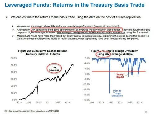 While the Fed suggests that the hedge fund basis trades leverage is above 50x, the Treasury Borrowing Advisory Committee wrote in January that “20x appears to be a good approximation of leverage typically used in these trades.”
