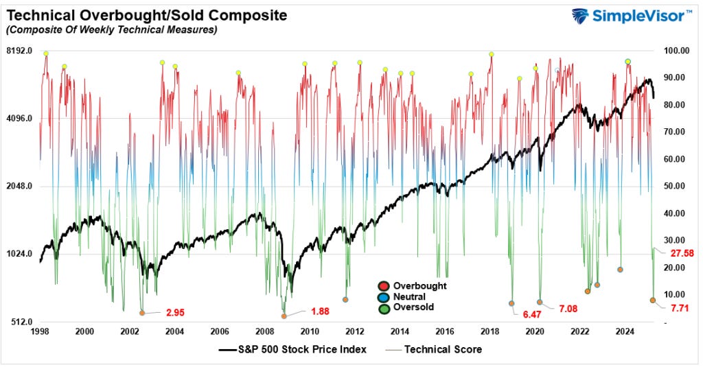 “As noted, we expect a sizable rally soon. While such a rally will undoubtedly make investors more bullish on the markets, we will use that rally to reduce portfolio volatility until a more durable market bottom is identified. Furthermore, we are triggering an important weekly sell signal. Still, the markets are simultaneously three standard deviations below their longer-term moving average, challenging the rising trend line from the October 2022 lows. Such oversold conditions typically precede short-term rallies, allowing us to reduce exposure to equities between 5500 and 5700. While the rally could be more significant, we will use those levels to begin risk reductions.”