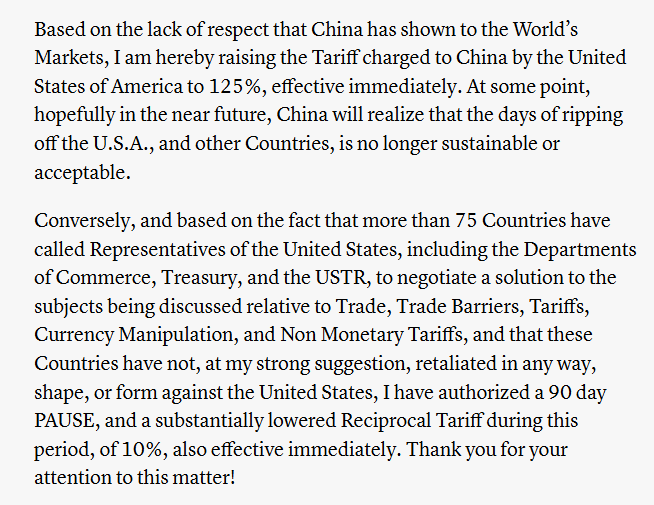 That battle persisted this week as Trump raised tariffs on China to 104%, and China then retaliated with a further tariff increase of 84%. However, as we said last week, any good news would cause the market to rally sharply. On Wednesday, President Trump announced a 90-pause on the full effect of new tariffs. Interestingly, the same headline sent stocks surging on Monday but was quickly deemed “fake news” by the White House. I suspect that Monday was a “leak” by the White House to test the market response, and President Trump kept that announcement handly to stave off a further decline in the markets. Whatever the reason, the markets needed the break. Here is Trump’s full statement: