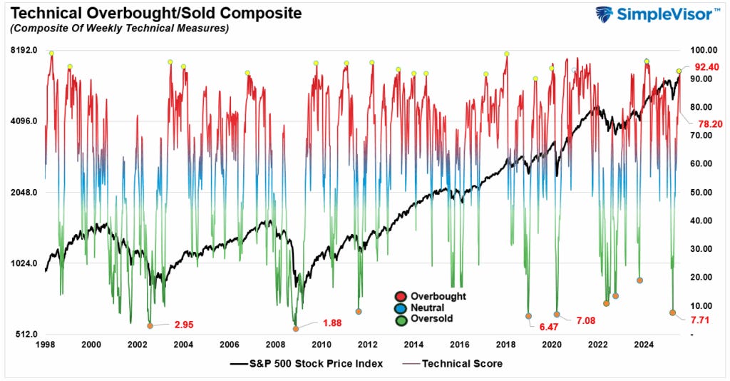 Last week, we noted, “Markets are pushing into more overbought territory, and pullbacks to support are likely.” That pullback started this week, with the technical gauge falling from a reading of 92.40 to 78.20. On a weekly basis, the markets are still overbought, and corrective actions are likely to continue.