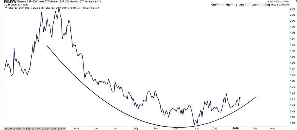 The S&P 500 ended the first week of 2026 with a gain of roughly 1.1%, marking a positive start to the year. Notably, the index rose in four of the first five trading sessions, driven by strength in energy and financials, as well as a rotation into cyclical sectors. That rotation is something we discussed over the last several weeks, and we are now seeing value outperform growth as market breadth improves.