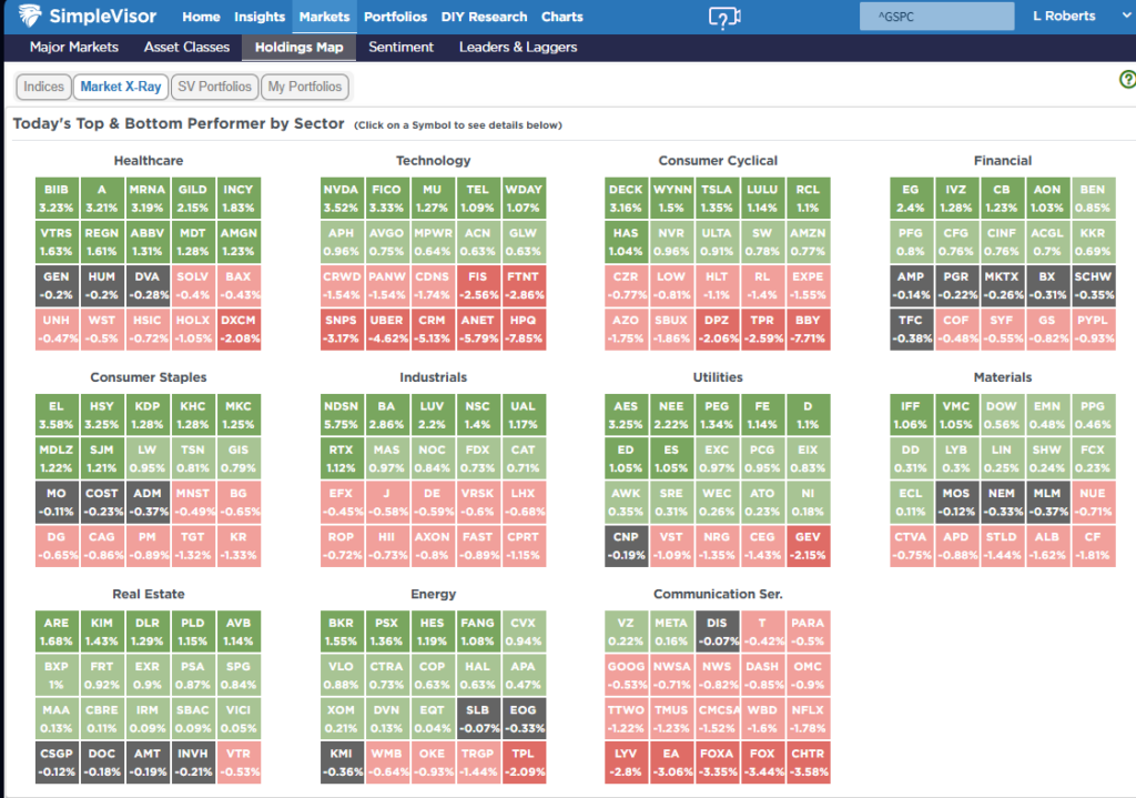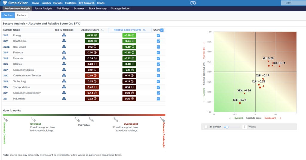 The table compares the relative performance of each sector and market to the S&P 500 index.