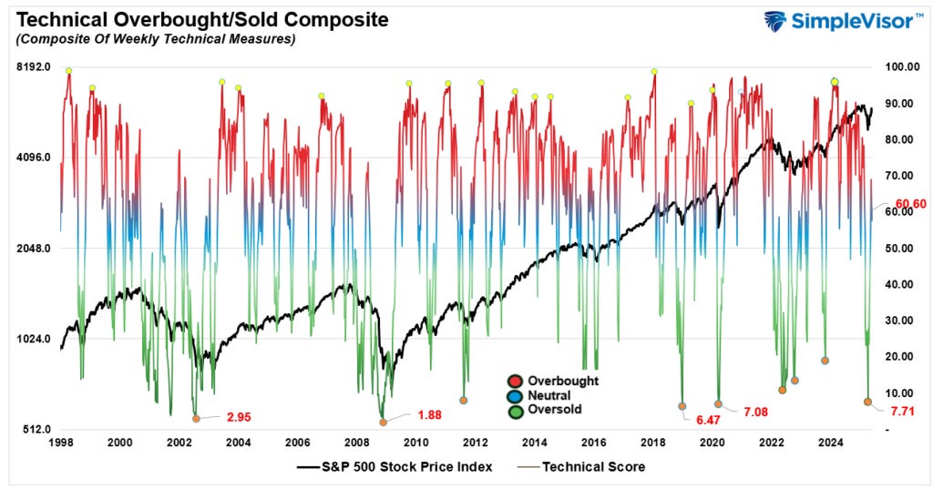 “Even with Bessent’s comments, that market remains overbought in the short term, and a further consolidation process is likely to occur next week. At the end of this week, we removed our short-market hedge, added to bonds, and reduced equity exposure. If the market is going to consolidate, we can allow cash to act as the primary hedge. However, if the 200-DMA is violated, the 50-DMA will become the next critical support. From a bullish perspective, the 20 and 50-DMAs are now sloping positively, which should provide rising support levels. Overall, we suspect that the market will stabilize. Of course, there are always risks to be aware of, so increased cash levels are essential now.”