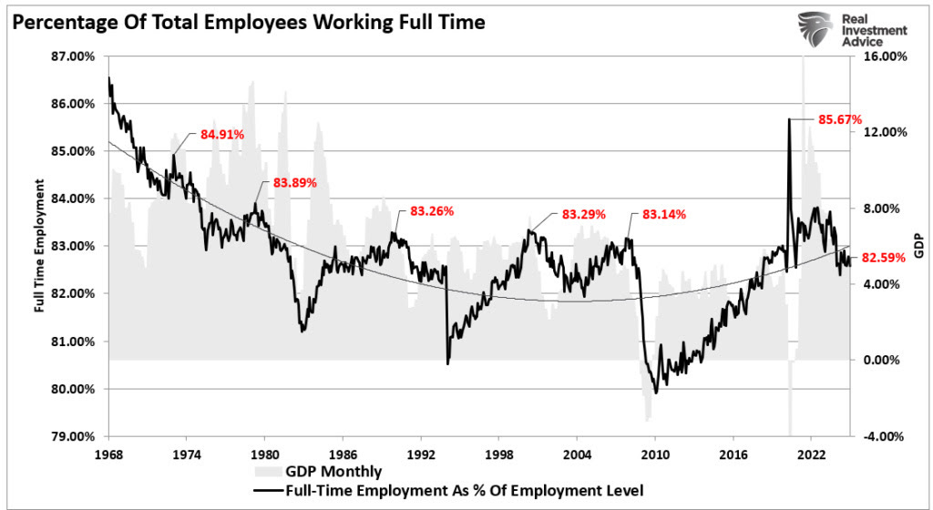 As noted above, employment is required to create consumption and increase economic activity. Crucially, “full-time” employment is required to create stronger economic growth rates, providing higher incomes, benefits, and household stability. Notably, peaks in full-time employment relative to the total number of employed civilians have correlated with weaker future economic outcomes and disinflationary impacts. (The only exception was 2020, as mass employment terminations created a temporary bump in full-time employment.)