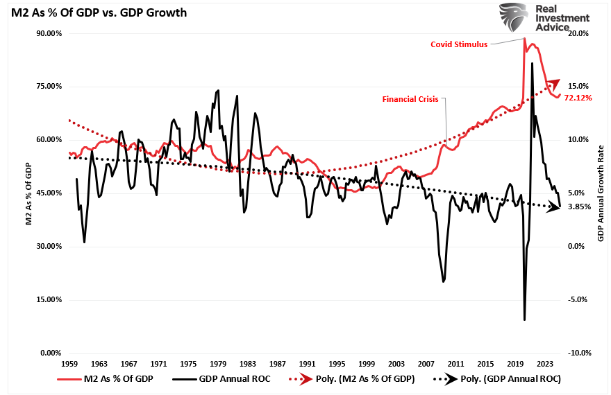 As we noted last year, the crucial point that continues to elude most economists is that the economic decline will gain traction as that “adrenaline” boost fades. Had the economy been growing at 5% nominal, as in 2019, the decline from the post-pandemic peak would already register a recession. However, given that nominal growth neared 18%, it has taken far longer than many expected for economic decline to return to previous norms of just 2% annual growth.