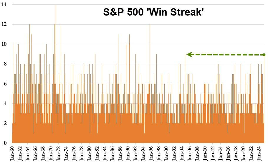 Notably, the rally from the recent lows, which has seen the market rise for 9 consecutive days, is one of the longest win streaks in 20 years.