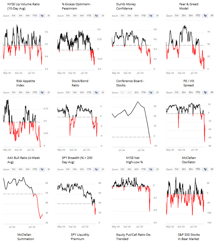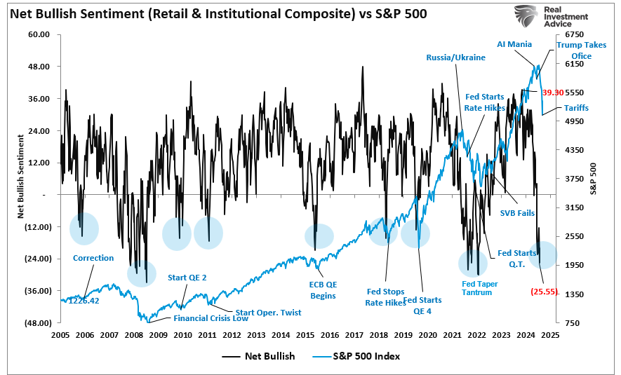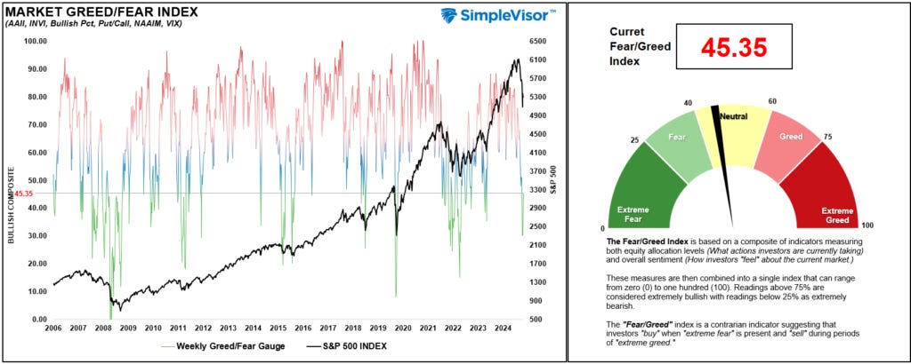 Furthermore, the sharp spike in the volatility index, which is considered a “market fear gauge,” spiked to the highest levels seen since the COVID pandemic. If we combine the sentiment measures with the volatility index, we again see more extreme negative readings that often coincide with market lows rather than the beginning of larger reversions.