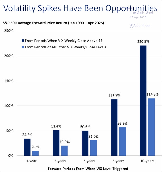 Here is one last example. Price volatility, particularly when prices are declining rapidly, elicits our emotional response of panic. However, while rising volatility from low levels is a risk-off warning, high levels of volatility have often been a risk-on indicator. When the VIX closes above 45, which signals extreme investor fear, it has historically marked strong long-term buying opportunities. Following such spikes, the S&P 500 has more than doubled on average over five years, significantly outperforming periods of lower volatility. Opportunistic rebalancing during these dislocations can enhance long-term portfolio resilience.