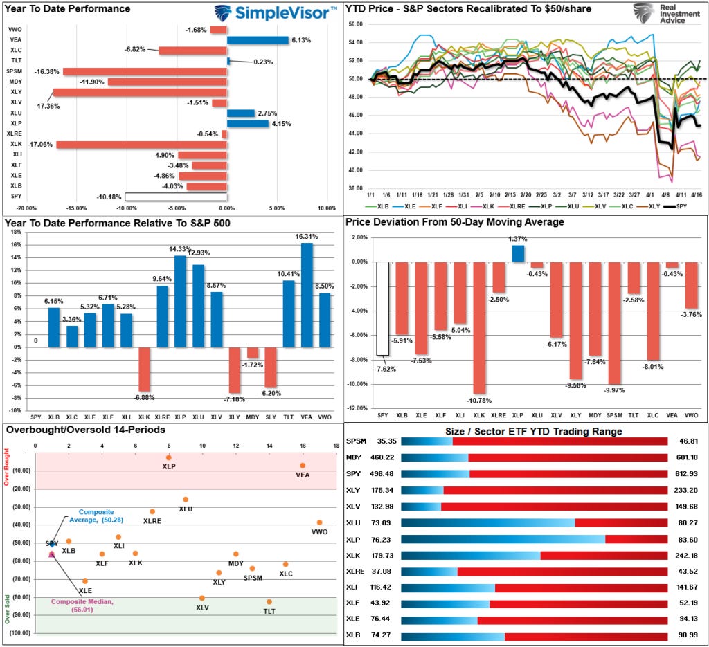 While the markets await the next Federal Reserve meeting, the uncertainty over monetary policy weighs on markets as much as the uncertainty about tariffs. This past week, the market reversed some of its gains from the massive “tariff reprieve” surge. With the MACD back on a buy signal and money flows turning positive, buyers are tepidly stepping back into the market. The 20-DMA continues to act as overhead resistance, defining the current downtrend. While there is undoubtedly a risk of another test of recent lows, which should be expected and why caution remains advisable, a break above the 20-DMA would lead to a rally to the 50-DMA. (Monday’s article will address the “Death Cross” and what it means for investors.)