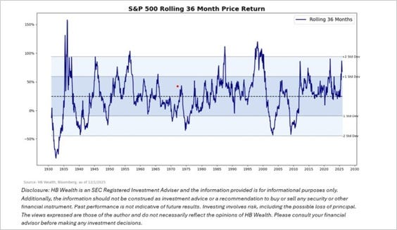 “The S&P 500 has posted a strong three-year price return of approximately 76.7 percent, excluding dividends. That translates to an annualized return of 20% to 22%. This is well above the long-term average annual return of roughly 10% to 11% with dividends reinvested. Such elevated returns over a short period suggest that the market is trading well above its historical trend. Historically, when the S&P 500 rolling 3-year return is two standard deviations above its three-year moving average, the market is statistically extended. This deviation typically precedes a shift in volatility and return outcomes. In other words, when markets reach this level of extension, two patterns emerge: increased volatility and weaker forward returns.”