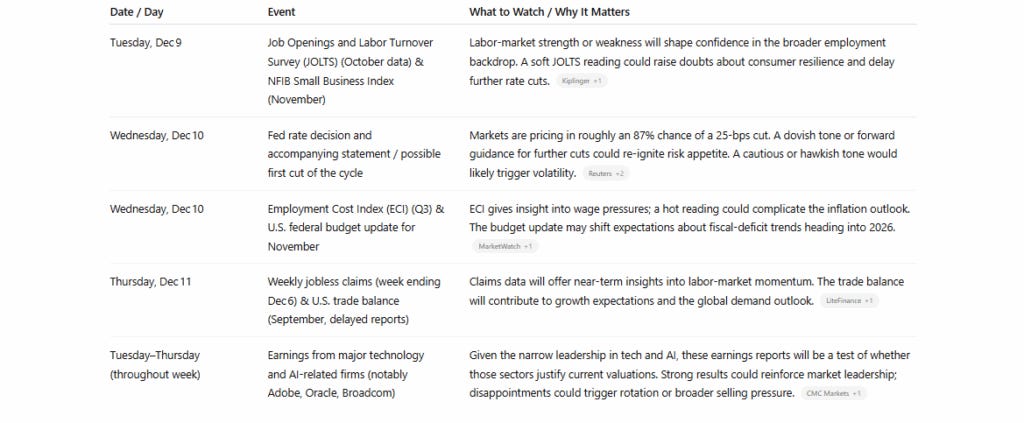 This week offers a high‑stakes test of sentiment. If liquidity (through the Fed’s policy) aligns with solid economic and earnings data, the rally could broaden beyond mega‑caps and extend into 2026. If not, this “year‑end bounce” risks fading or turning into a broader reassessment.