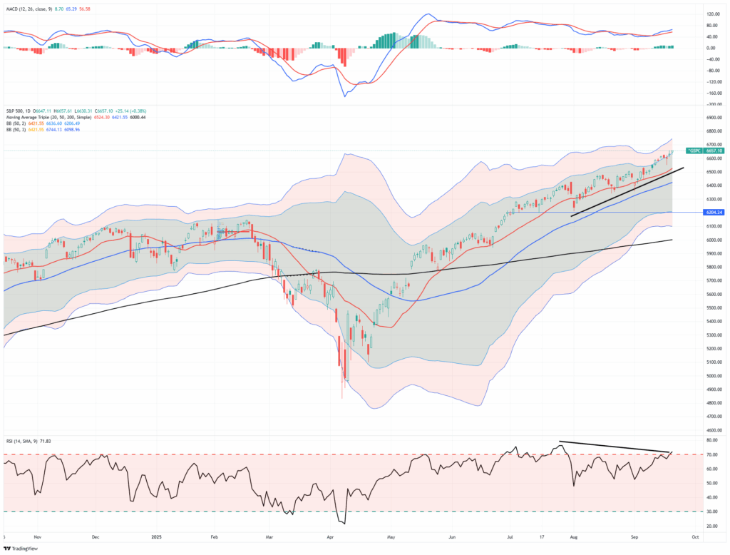Support and Resistance Levels: The S&P 500’s near-term support lies at the 20-day moving average (~6,524). The 50-day moving average is roughly in the ~6,420 region but there is deeper support near ~6,200, connected with the previous pullback. Resistance is around the most recent highs in the 6,700 area (2- 3 standard deviations above the 50-DMA). Notably, volatility (as measured by VIX) remains relatively subdued. The 200-day moving average remains key support for a more significant correction. (~6000)