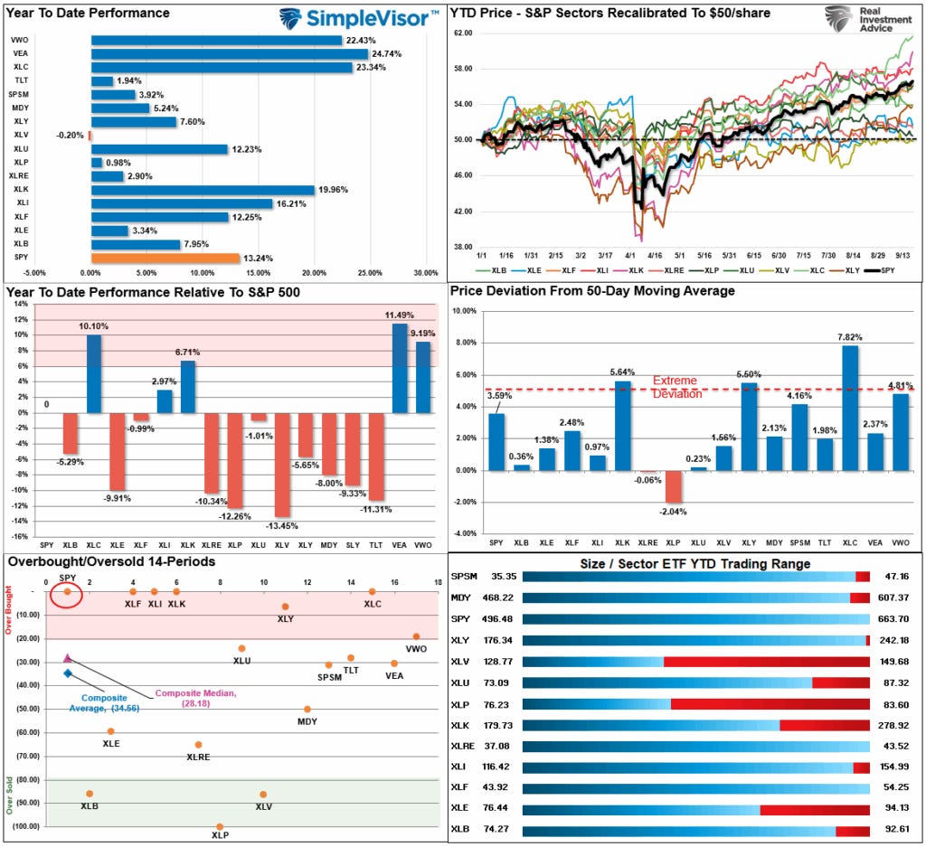 While the clear winner over the last five years has been to chase technology stocks or large-cap stocks in general, the build-up of complacency and deviations from long-term means is a risk worth considering. As noted, from a technical perspective, overbought conditions exist on multiple levels, from relative strength to momentum to deviations from long-term means. These technical warning signs often precede periods of consolidation or correction.