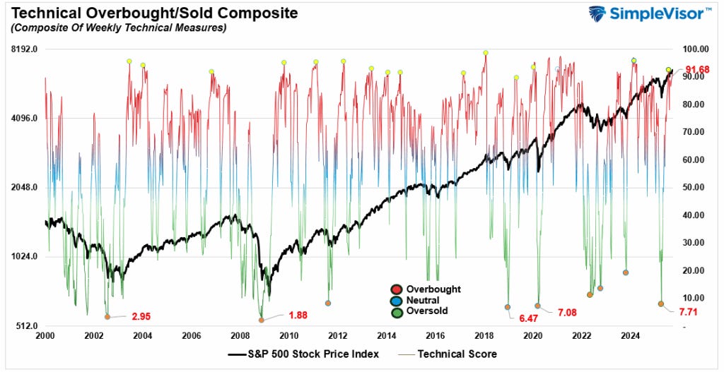 Artificial intelligence has captured Wall Street’s imagination. The investment thesis is clear: AI will reshape industries, generate new efficiencies, and create trillion-dollar opportunities. Companies with exposure to AI infrastructure, cloud computing, and data centers are the primary beneficiaries. Unsurprisingly, investors have responded by concentrating capital in a narrow group of stocks, driving valuations higher and fueling the current rally. The chart below shows the Global X Artificial Intelligence ETF (AIQ), sporting overbought conditions not seen since just before the April “Liberation Day” sell-off.