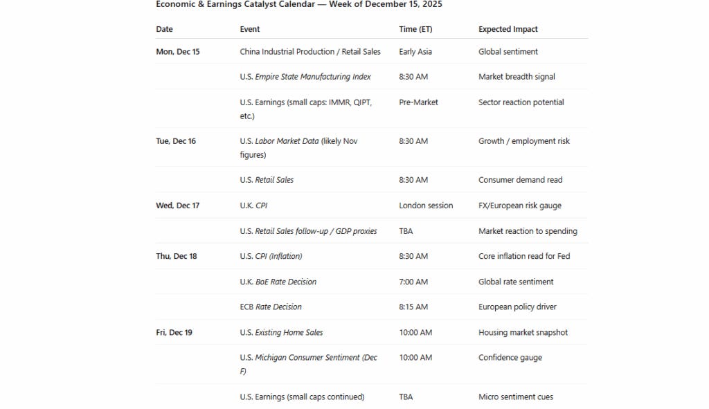 Market participants enter the week with several critical macroeconomic releases and a modest earnings slate that could drive volatility as year‑end positioning accelerates. The week begins with regional manufacturing data overseas that influences global sentiment, but U.S. economic indicators gain focus from Tuesday onward. Mid-week labor and retail figures may impact the narrative on growth and consumer strength, especially following the recent dovish Federal Reserve communications. Thursday’s U.S. inflation data, a key gauge for the Fed’s policy outlook following its December rate cut, will likely be the most-watched release for fixed income and equities. Housing and consumer sentiment figures on Friday will round out the week, providing additional insights into the resilience of consumer spending.
