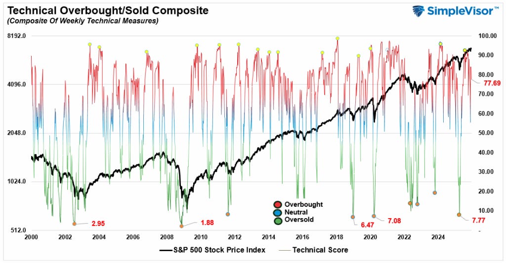The statement is interesting because it projects an increase in growth, but with slowing inflation and employment. Of course, this is also the threat from artificial intelligence. Expectations are that it will increase productivity, leading to stronger output, but also reduce costs and labor. Although that outcome will be great for corporate profitability, it is unlikely to be the outcome most Americans desire.